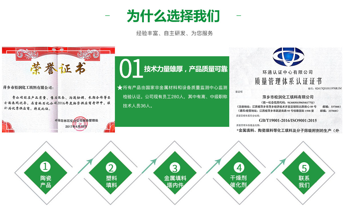 - 萍鄉(xiāng)市松潤化工填料有限公司位于江西省萍鄉(xiāng)市國家經(jīng)濟開發(fā)區(qū)西區(qū),是專業(yè)生產(chǎn)、經(jīng)營陶瓷、聚丙烯、金屬填料、塔內(nèi)件、水處理濾板、濾管、濾料、瓷球、分子篩、催化劑、活性炭、蜂窩陶瓷、瓷質(zhì)耐磨托輥等系列產(chǎn)品的民營企業(yè)。所有產(chǎn)品由國家非金屬材料和設備質(zhì)量監(jiān)測中心監(jiān)測檢驗認證。公司現(xiàn)有員工280人,其中有高、中級職稱技術人員36人。工藝先進,技術力量雄厚,產(chǎn)品質(zhì)量可靠,配... ...